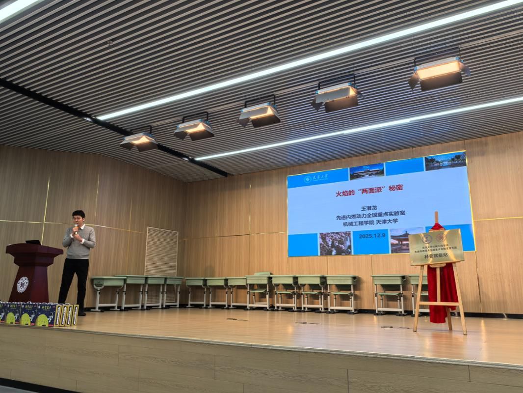 为深入贯彻落实习近平总书记关于科技创新与科学普及的重要指示精神,切实推进全国高校“双带头人”党支部书记“强国行”专项行动建设,2025年12月9日上午,先进内燃动力全国重点实验室党支部(以下简称实验室支部)赴天津市海河教育园区南开学校瑞明路校区开展了“科教融合育棠苗 科普赋能强国行”专题科普活动,并进行了科普赋能站揭牌仪式。先进内燃动力全国重点实验室副主任李云强、南开学校瑞明路校区管理部部长胡小玉出席活动。
