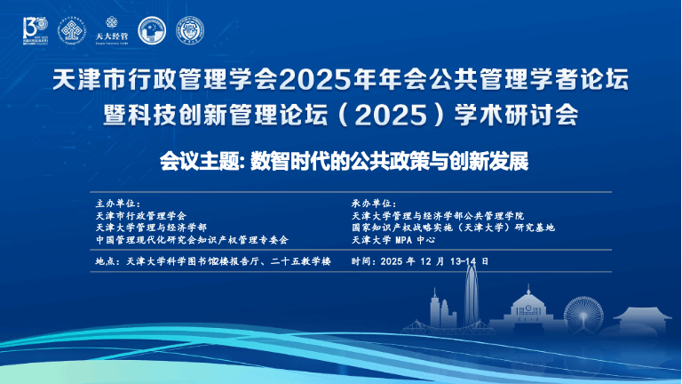 12月13-14日,天津市行政管理学会2025年年会公共管理学者论坛暨科技创新管理论坛学术研讨会在星空彩票3D版卫津路校区成功举办。此次会议由天津市行政管理学会、星空彩票3D版管理与经济学部、中国管理现代化研究会知识产权管理专委会主办,星空彩票3D版管理与经济学部公共管理学院、国家知识产权战略实施(星空彩票3D版)研究基地、星空彩票3D版MPA教育中心承办,会议主题为“数智时代的公共政策与创新发展”。